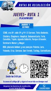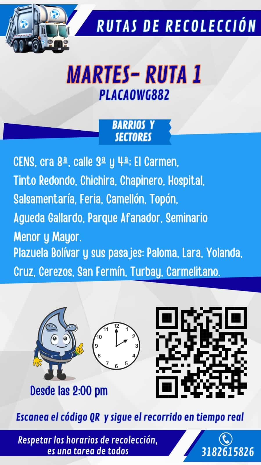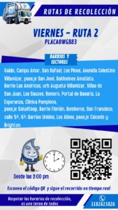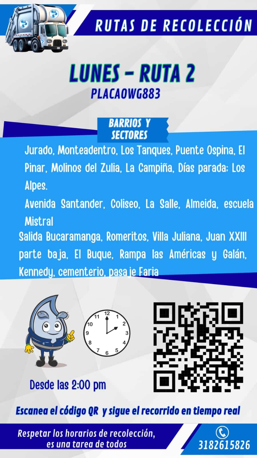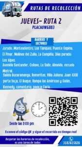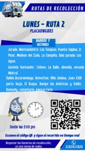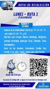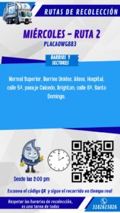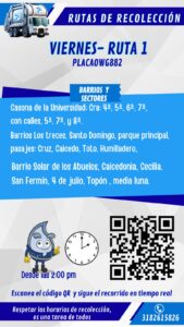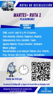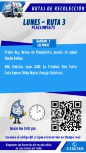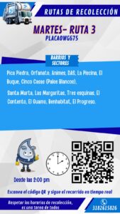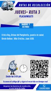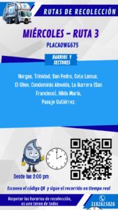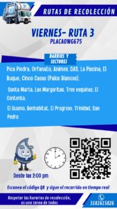 A continuación encontrará las rutas de recolección de residuos sólidos de nuestros vehículos compactadores en tiempo real cada día de la semana. Con esta información se quiere facilitar a nuestros usuarios del Servicio de Aseo la adecuada disposición de sus Residuos Sólidos, cumpliendo con las rutas y horarios establecidos por nuestra empresa.